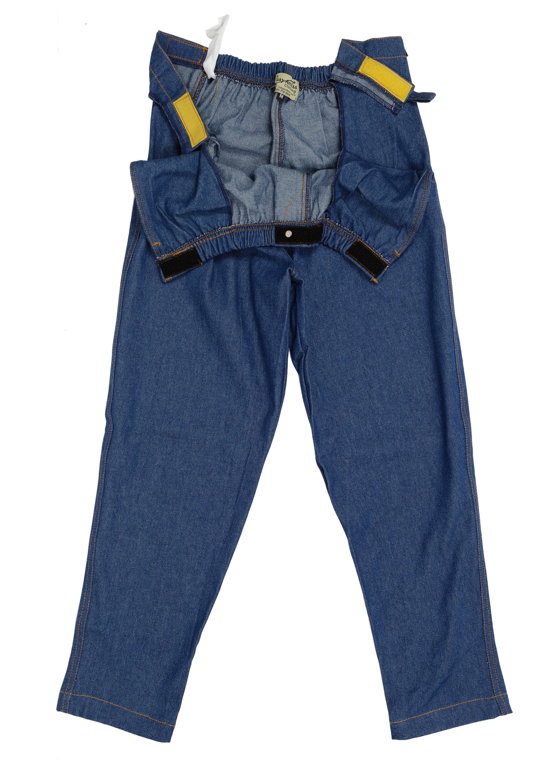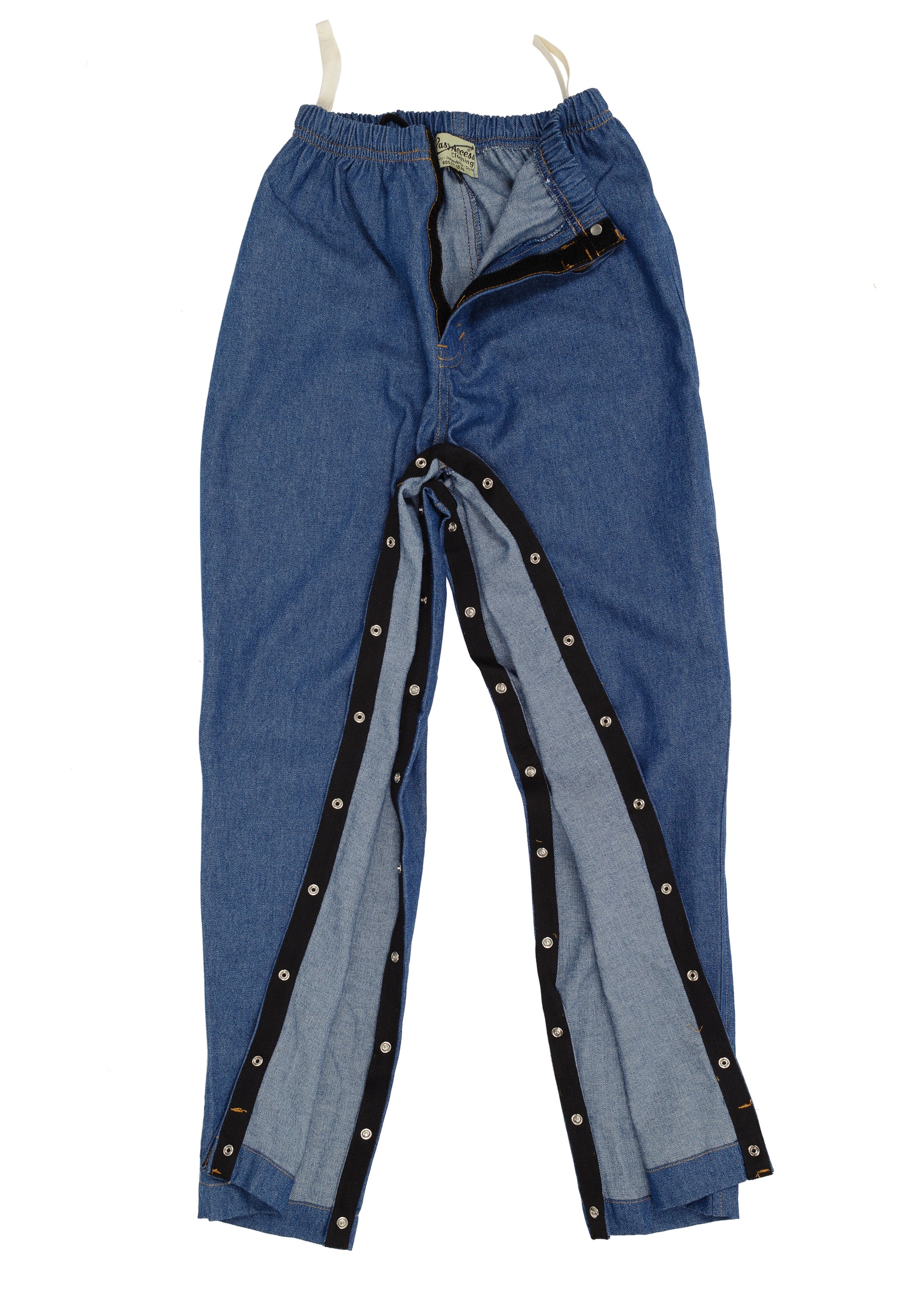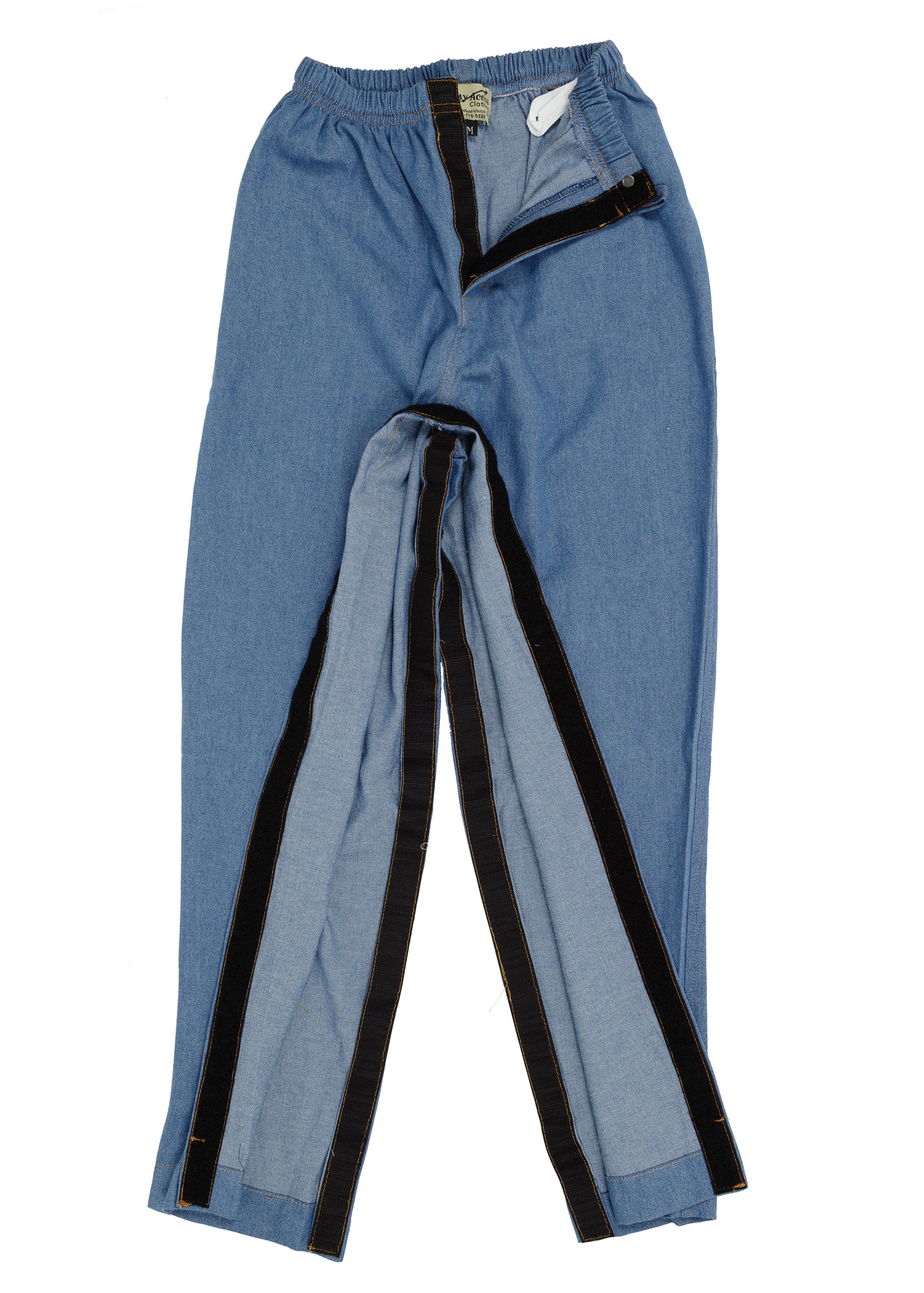 Made of light weight, soft pre-washed denim. Our Outside Seam opening comes with a two way zipper that opens from the waist down and the hem up. Open all the way and the pants can lay flat. No lifting, just wrap around. Our Inside Seam opening comes with either a snap or a Velcro™ closure. Snaps or zippers are good for industrial laundries.