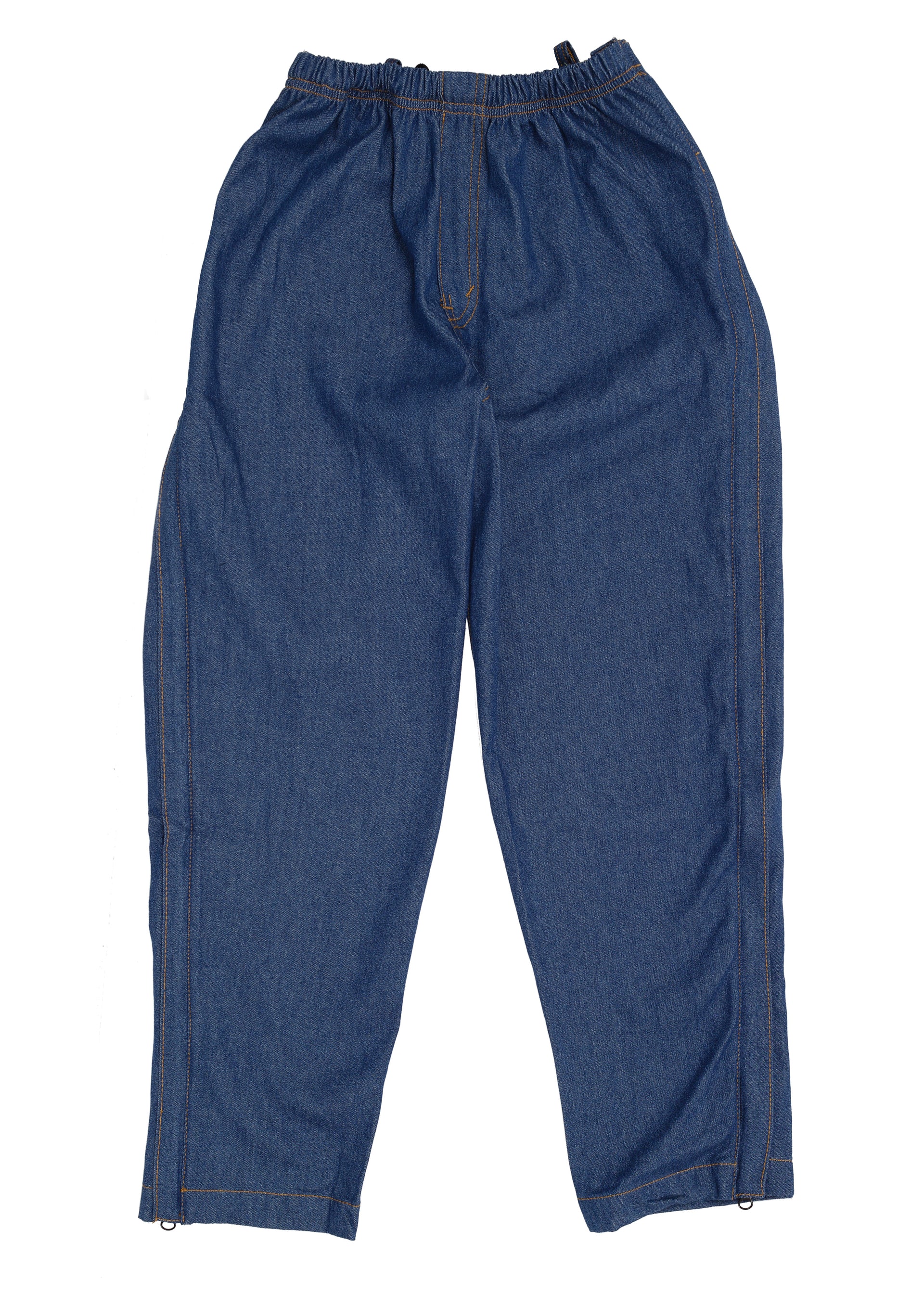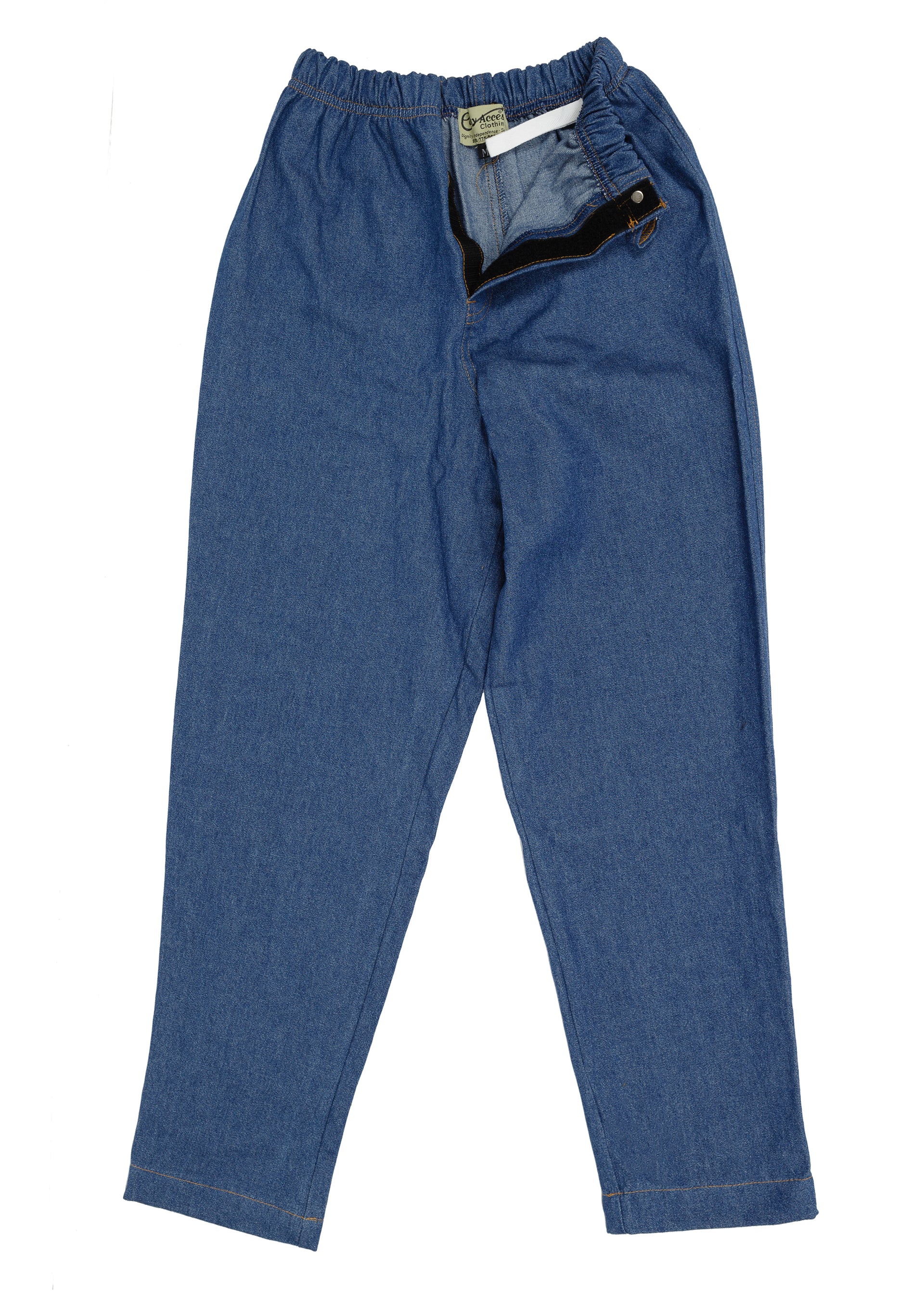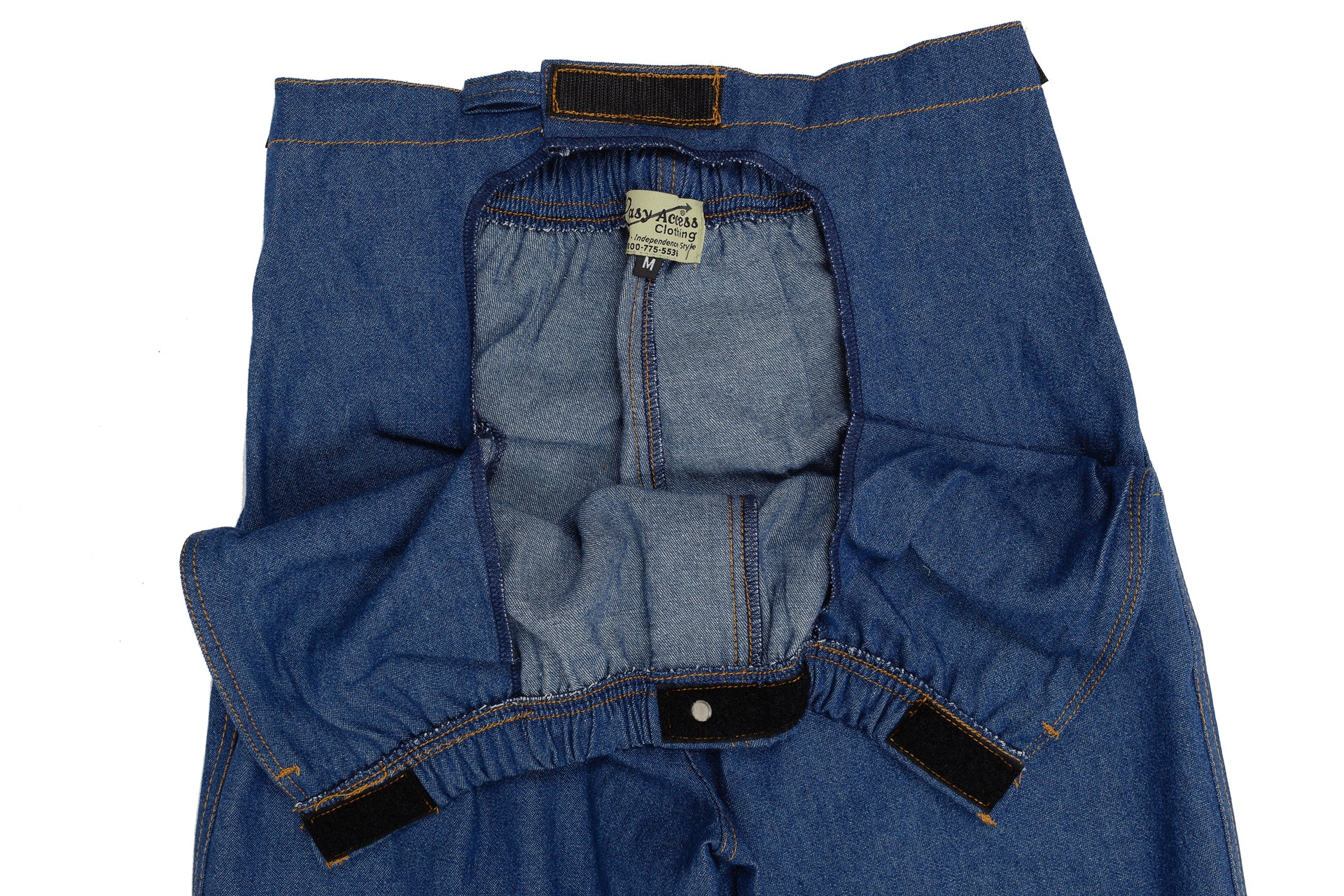 Made of light weight, soft pre-washed denim. Our Outside Seam opening comes with a two way zipper that opens from the waist down and the hem up. Open all the way and the pants can lay flat. No lifting, just wrap around. Our Inside Seam opening comes with either a snap or a Velcro™ closure. Snaps or zippers are good for industrial laundries.